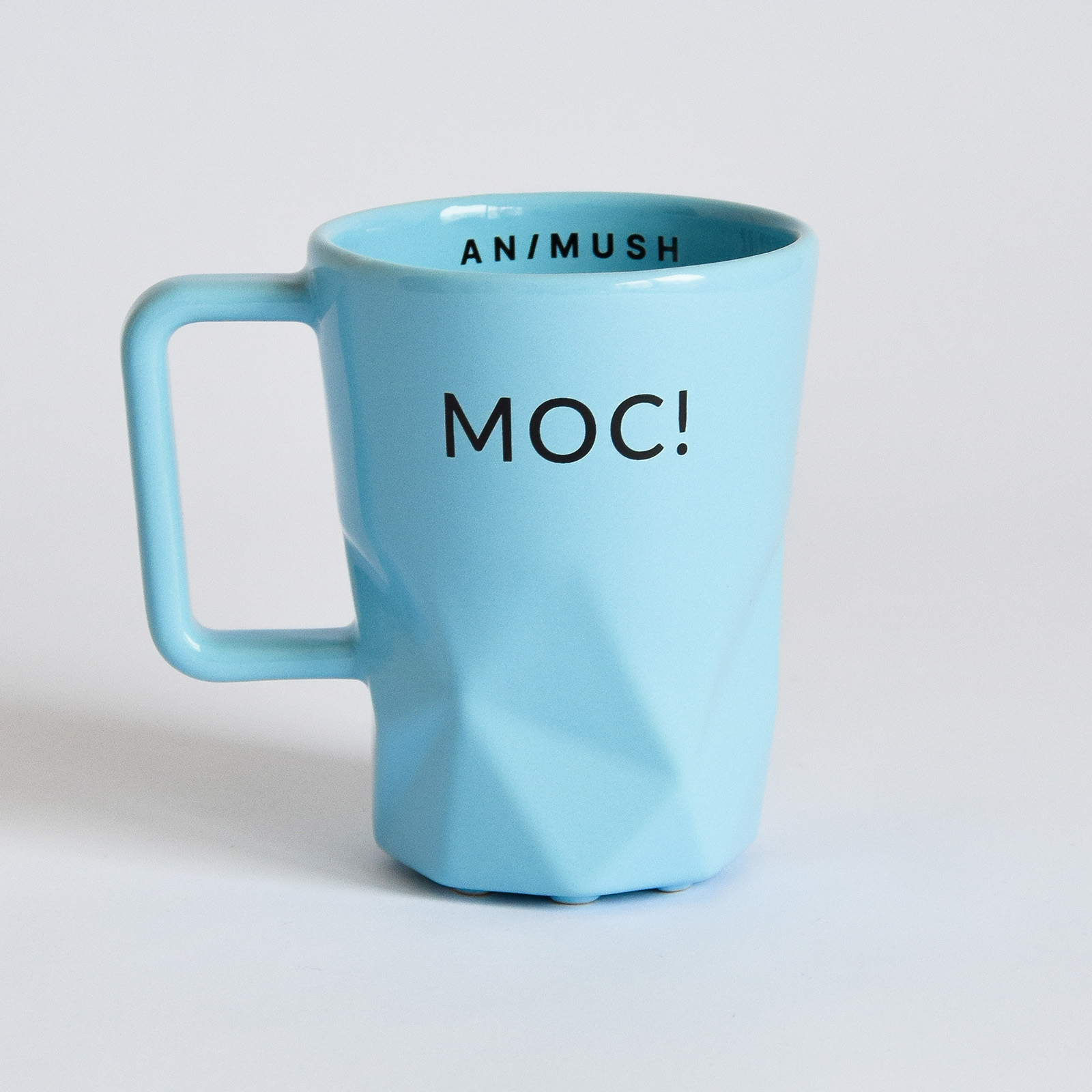 Kubek błękitny z trwałym nadrukiem MOC! na zewnątrz oraz logo ANIMUSH wewnątrz.