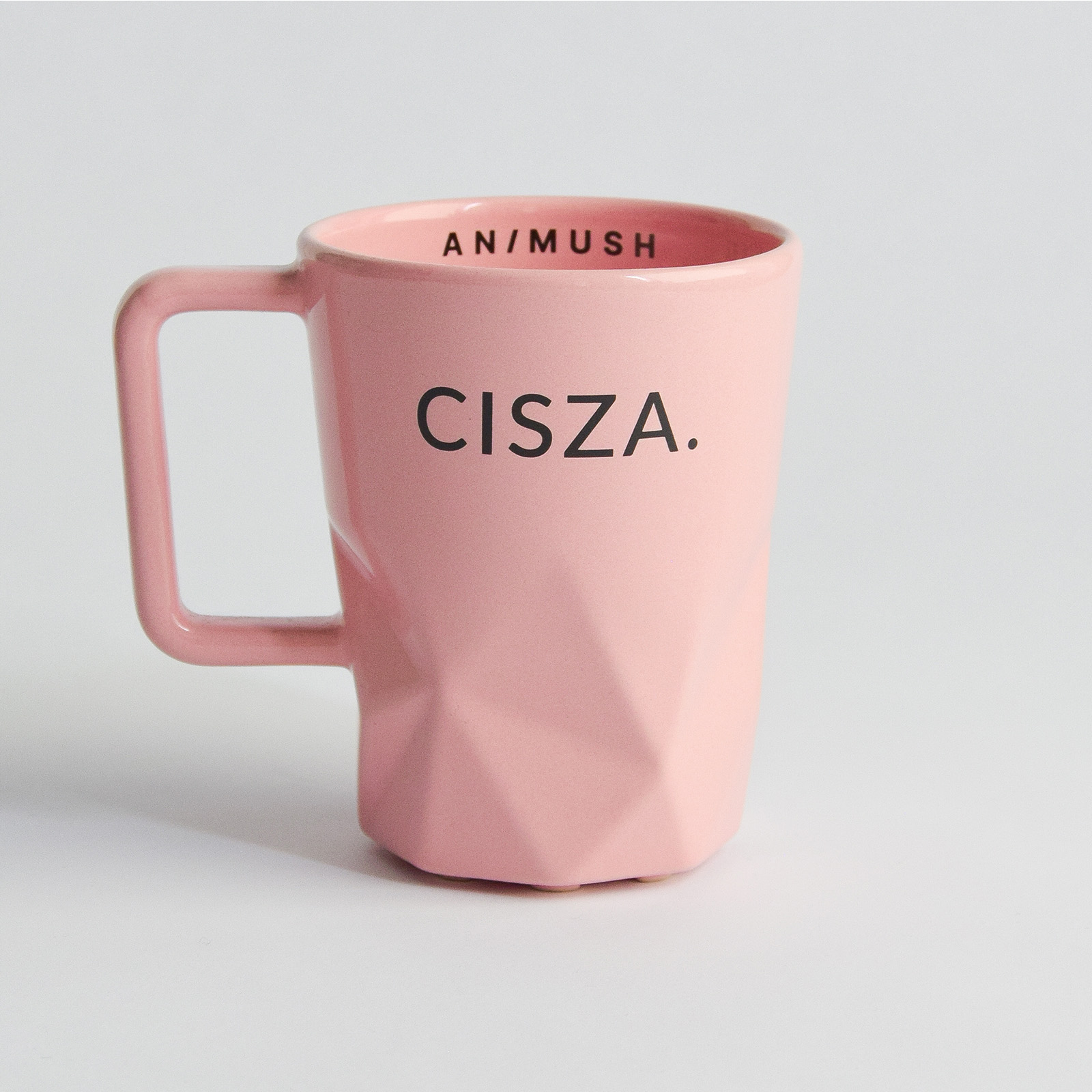 Kubek w kolorze różowym z trwałym nadrukiem CISZA. na zewnątrz oraz logo ANIMUSH wewnątrz.