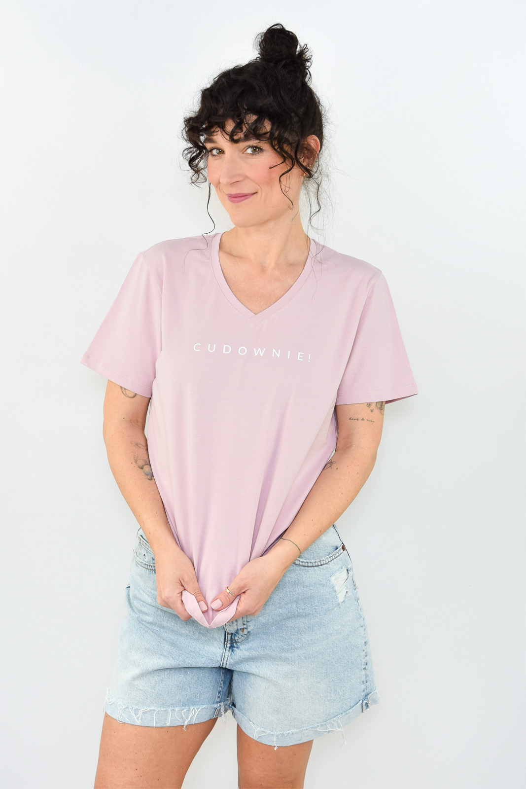 T-shirt oversize pudrowy róż z białym napisem CUDOWNIE!
