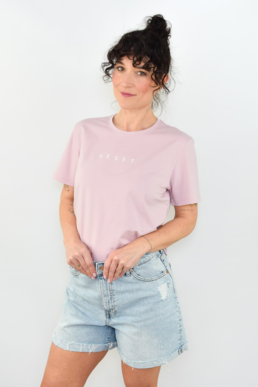T-shirt oversize pudrowy róż z białym napisem RESET.