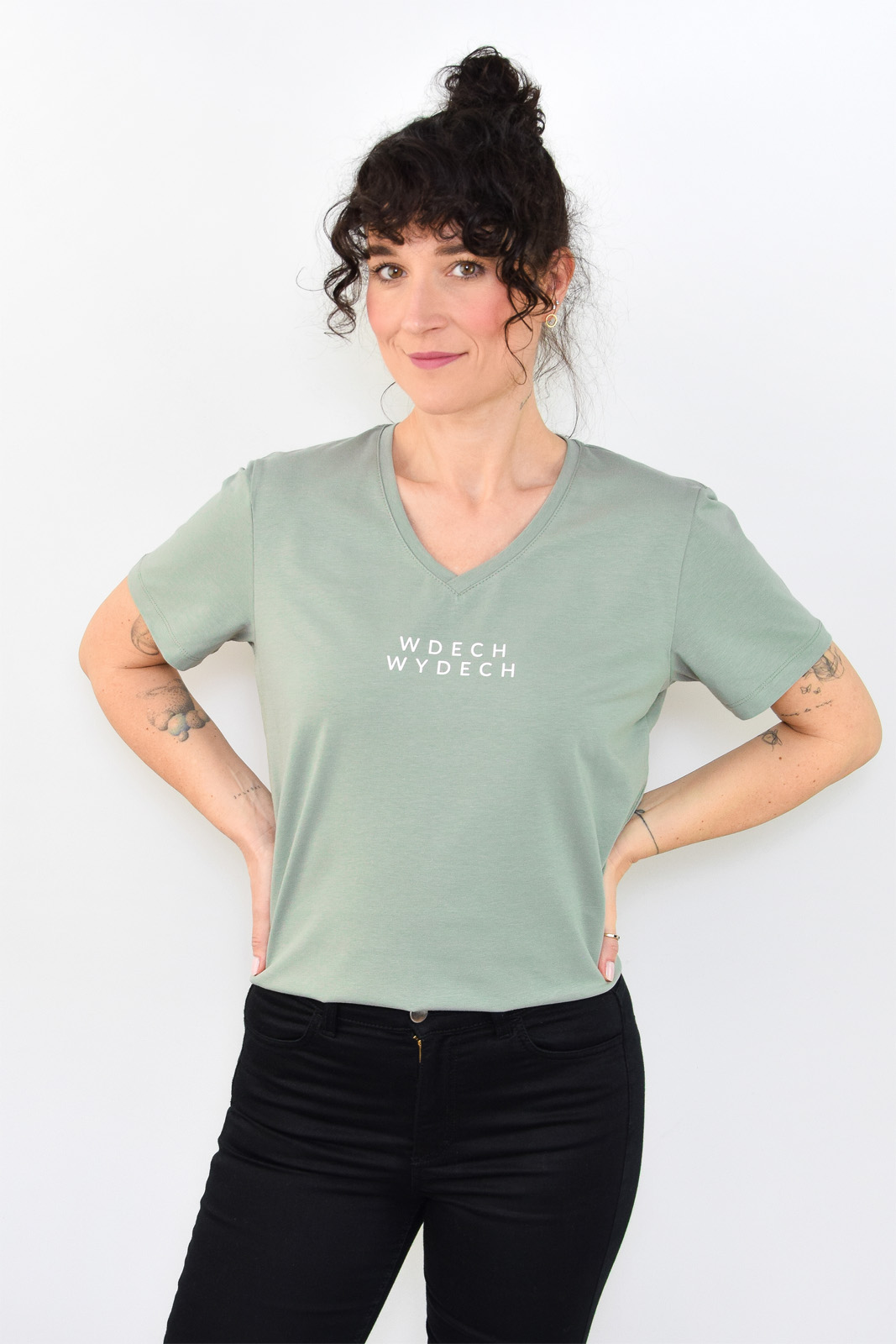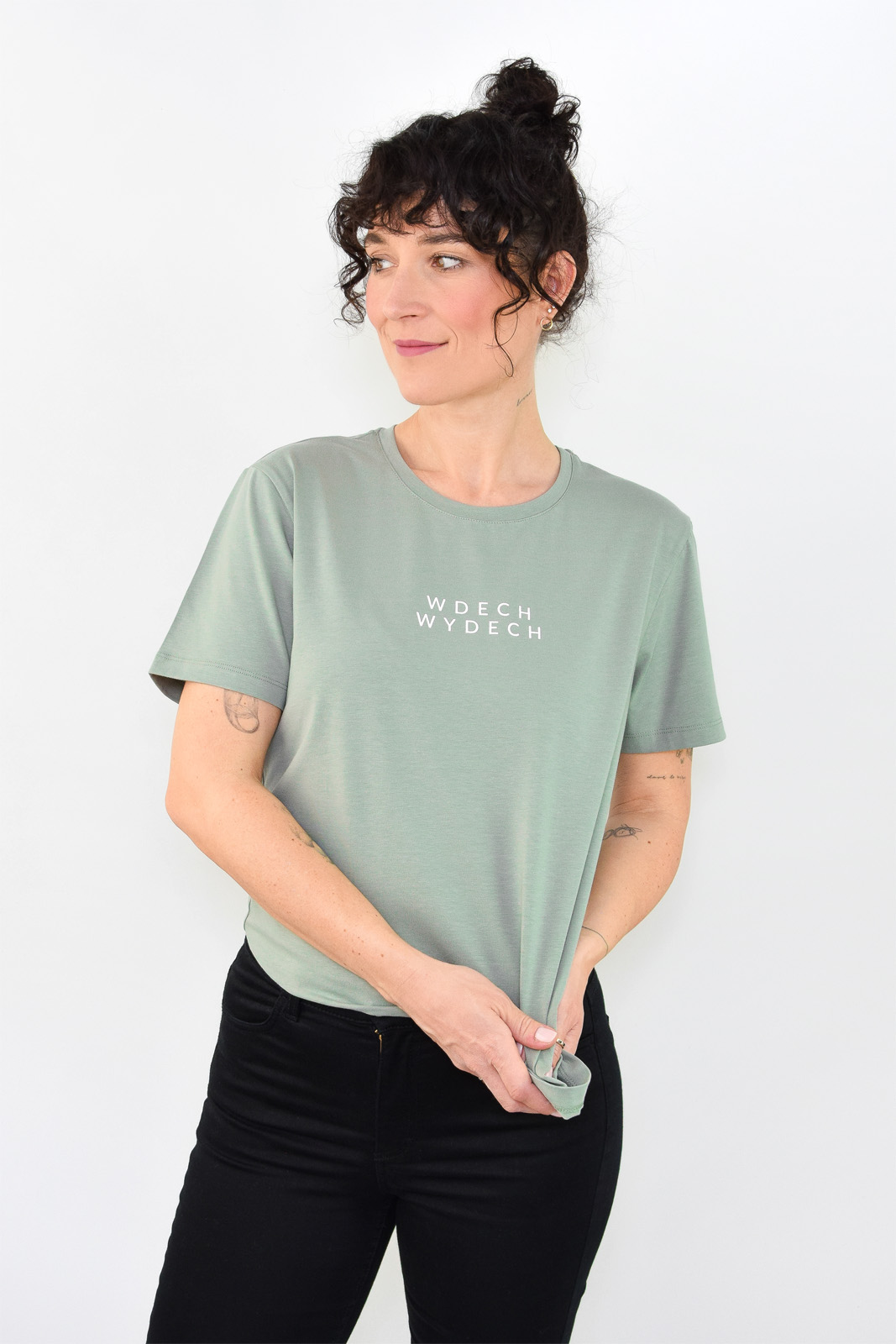 T-shirt oversize zgaszony szałwiowy z białym napisem WDECH WYDECH