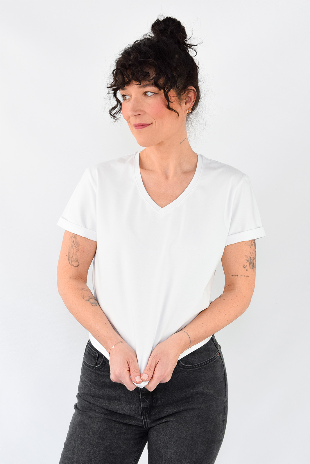Rękawki delikatnie dłuższe, dzięki czemu można je podwinąć.